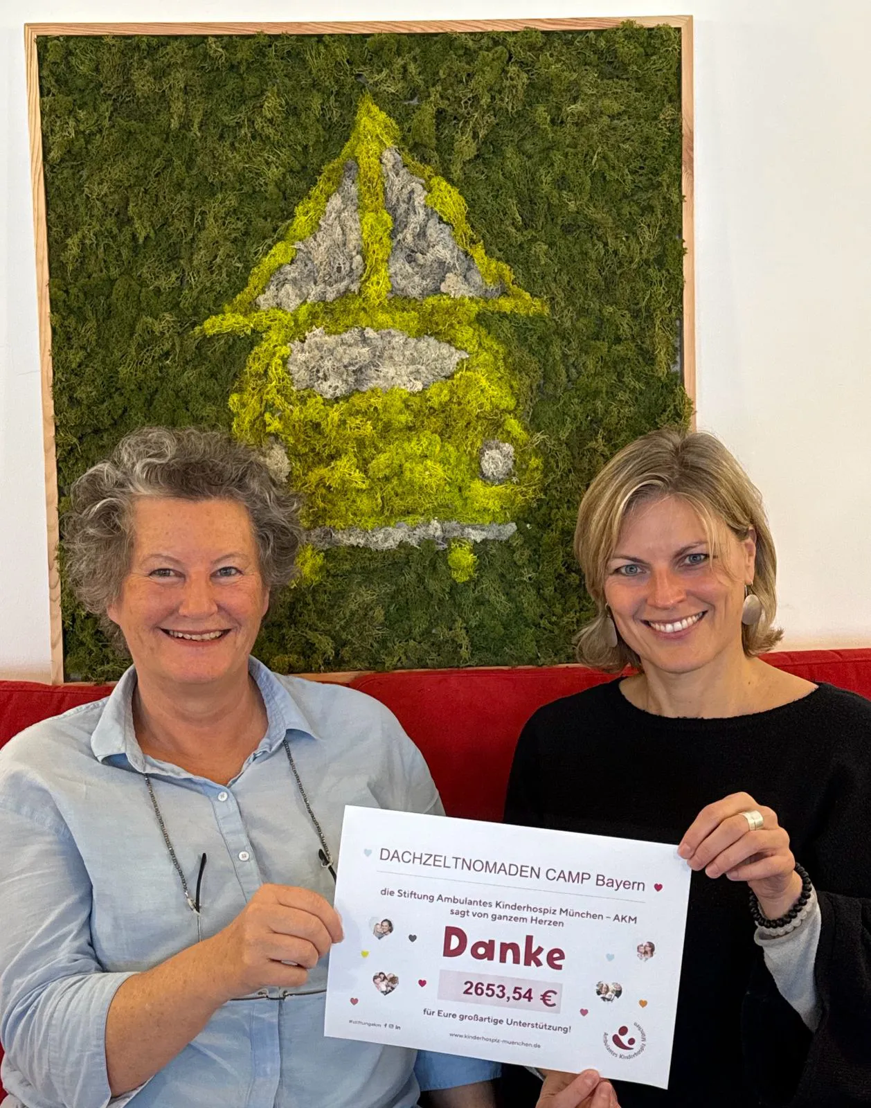 Unser Moosbild hat inzwischen auch ein neues Zuhause gefunden: Es hängt jetzt im AKM-Zentrum Landshut in Niederbayern! Vor drei Wochen hat Bettina, die Zentrumsleitung (links im Bild), unser Moosbild bei ihrem Besuch in der Zentrale in München entdeckt und hat sich sofort verliebt. Gemeinsam mit ihrer Fundraising-Kollegin Petra (rechts im Bild) hat sie uns dieses Foto zusammen mit einer Dankesurkunde geschickt. Wir freuen uns sehr, dass unser Moosbild so viel Freude bereitet!