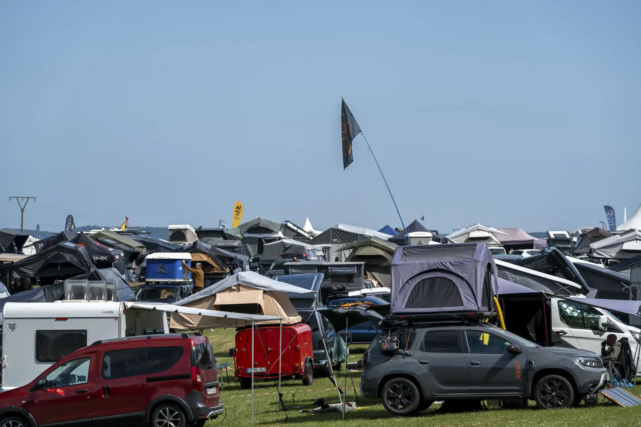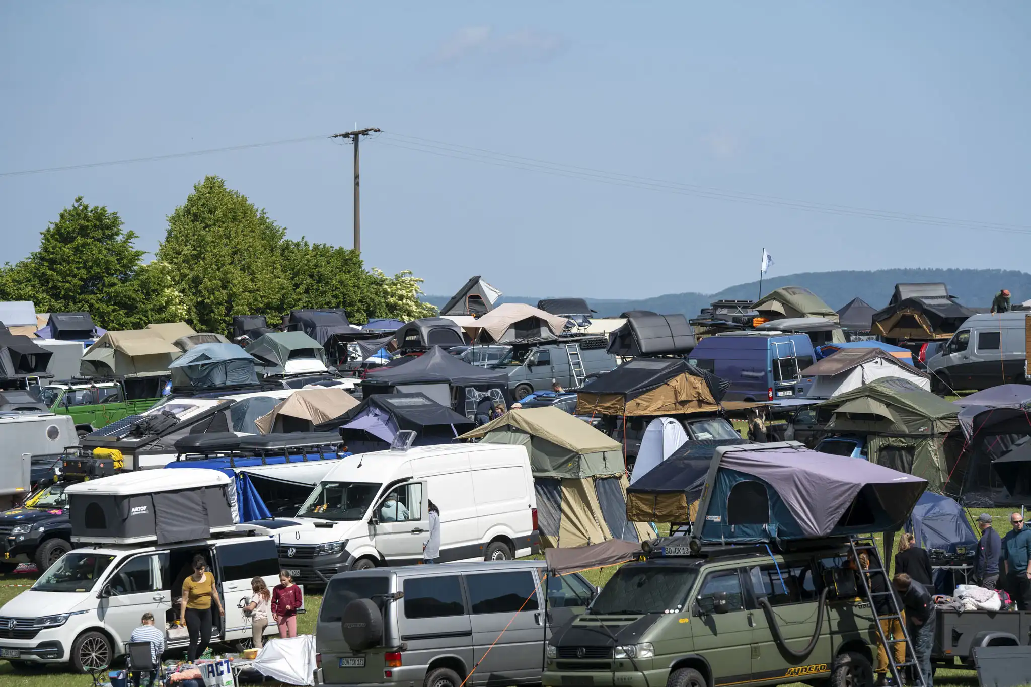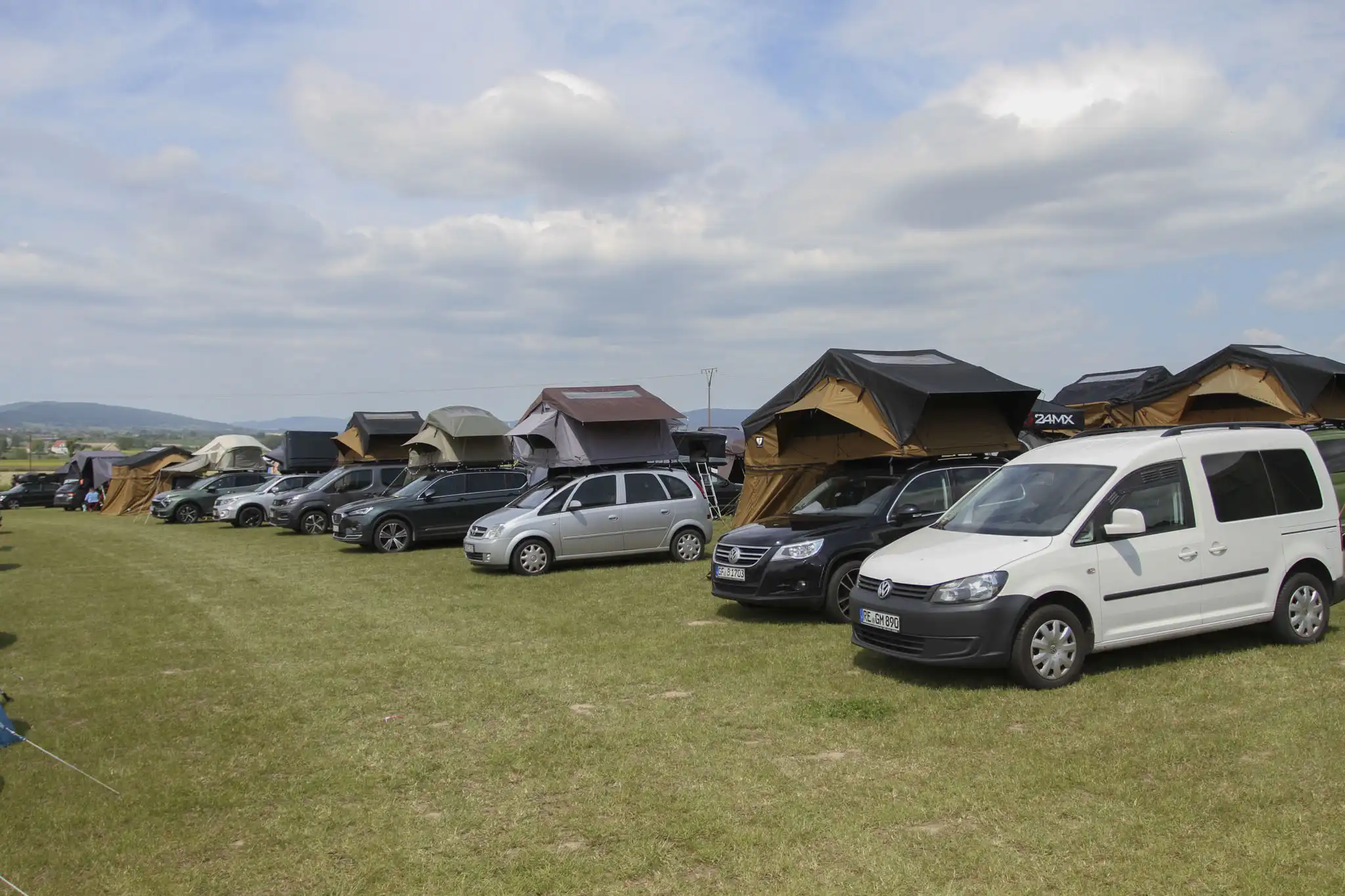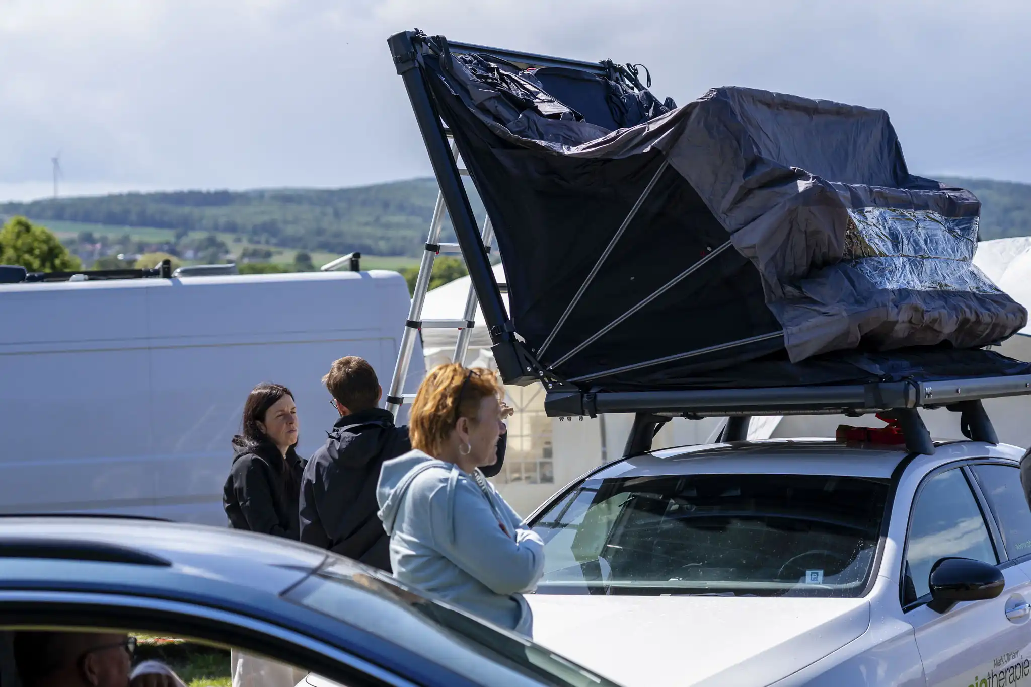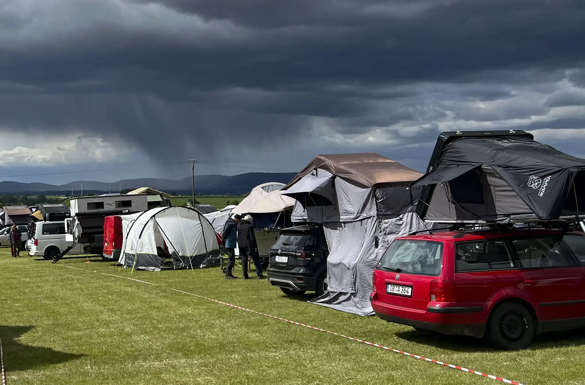 Trotz immer wieder kräftigen Regenschauern am Freitag lassen sich die Dachzeltnomaden die Laune nicht verderben. Sobald die Sonne wieder durchbricht, verwandelt sich das Gelände in ein buntes Meer aus Zelten und lachenden Gesichtern.