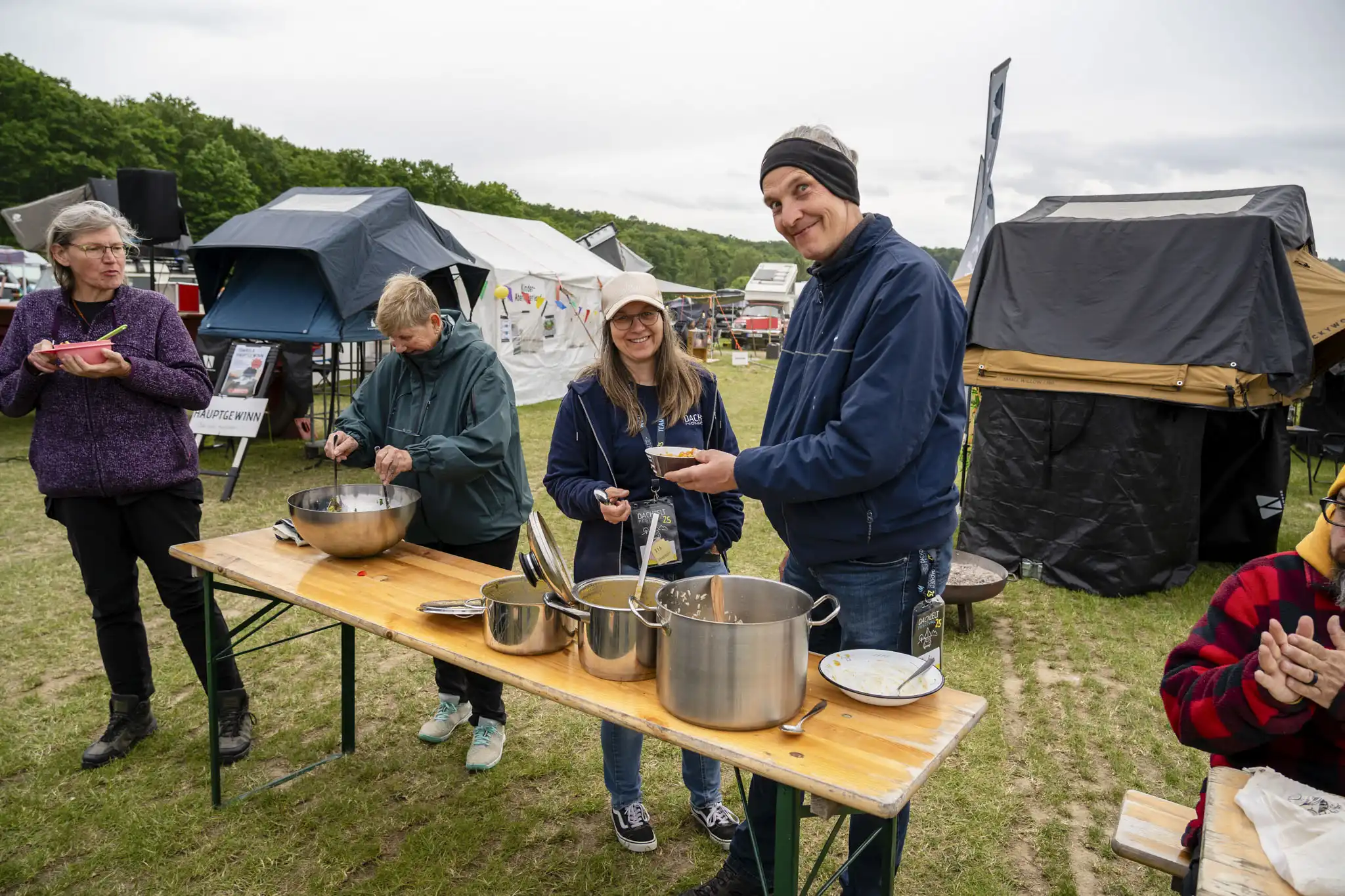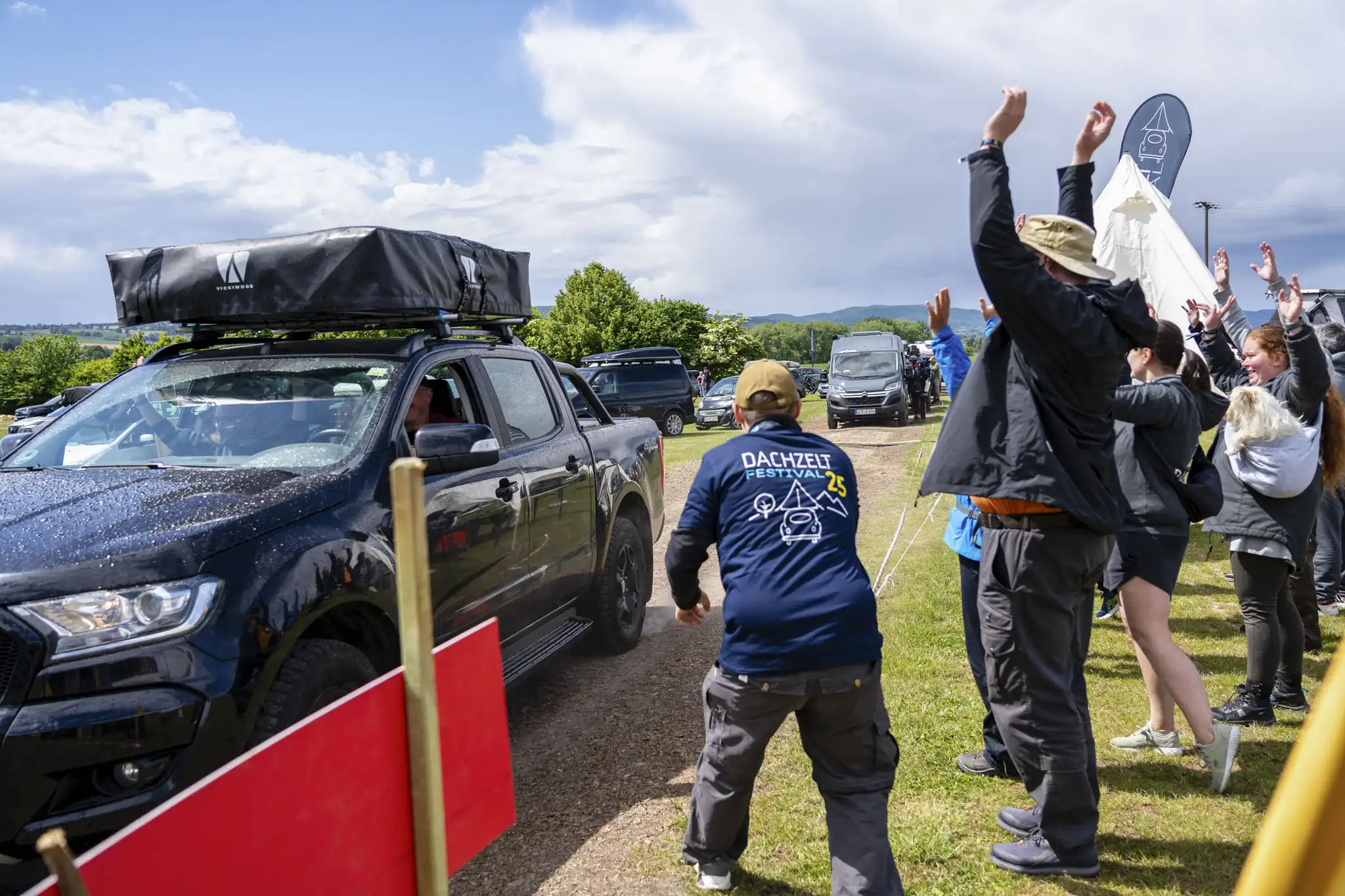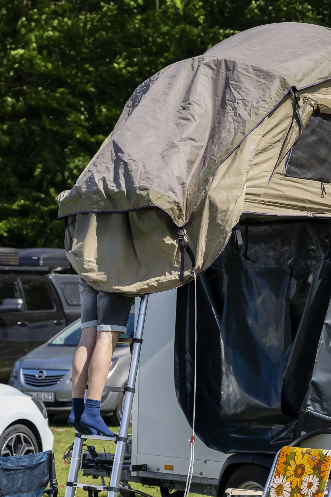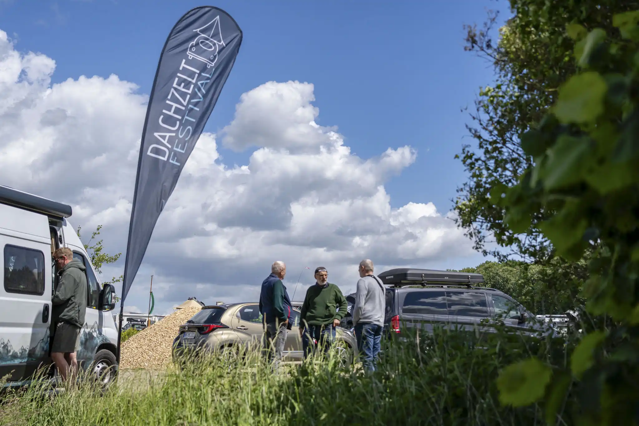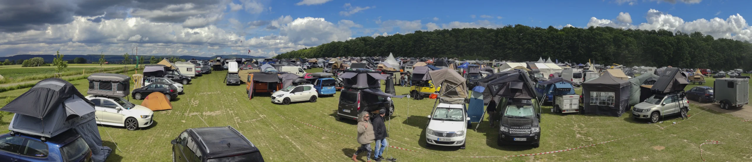 Trotz immer wieder kräftigen Regenschauern am Freitag lassen sich die Dachzeltnomaden die Laune nicht verderben. Sobald die Sonne wieder durchbricht, verwandelt sich das Gelände in ein buntes Meer aus Zelten und lachenden Gesichtern.