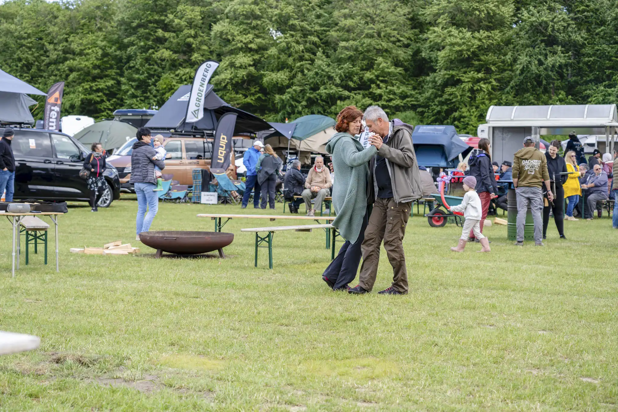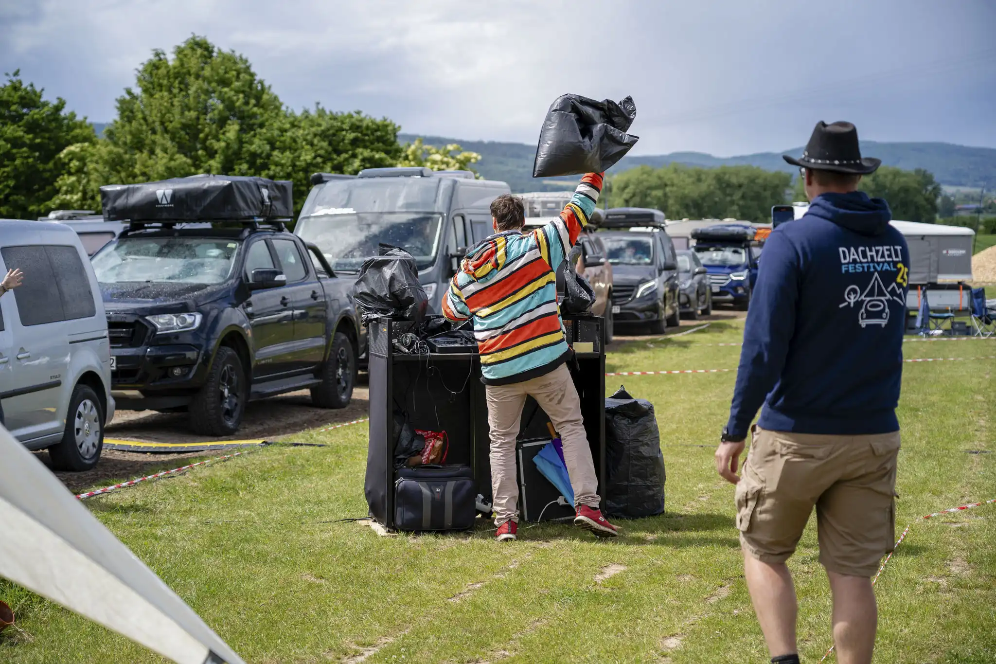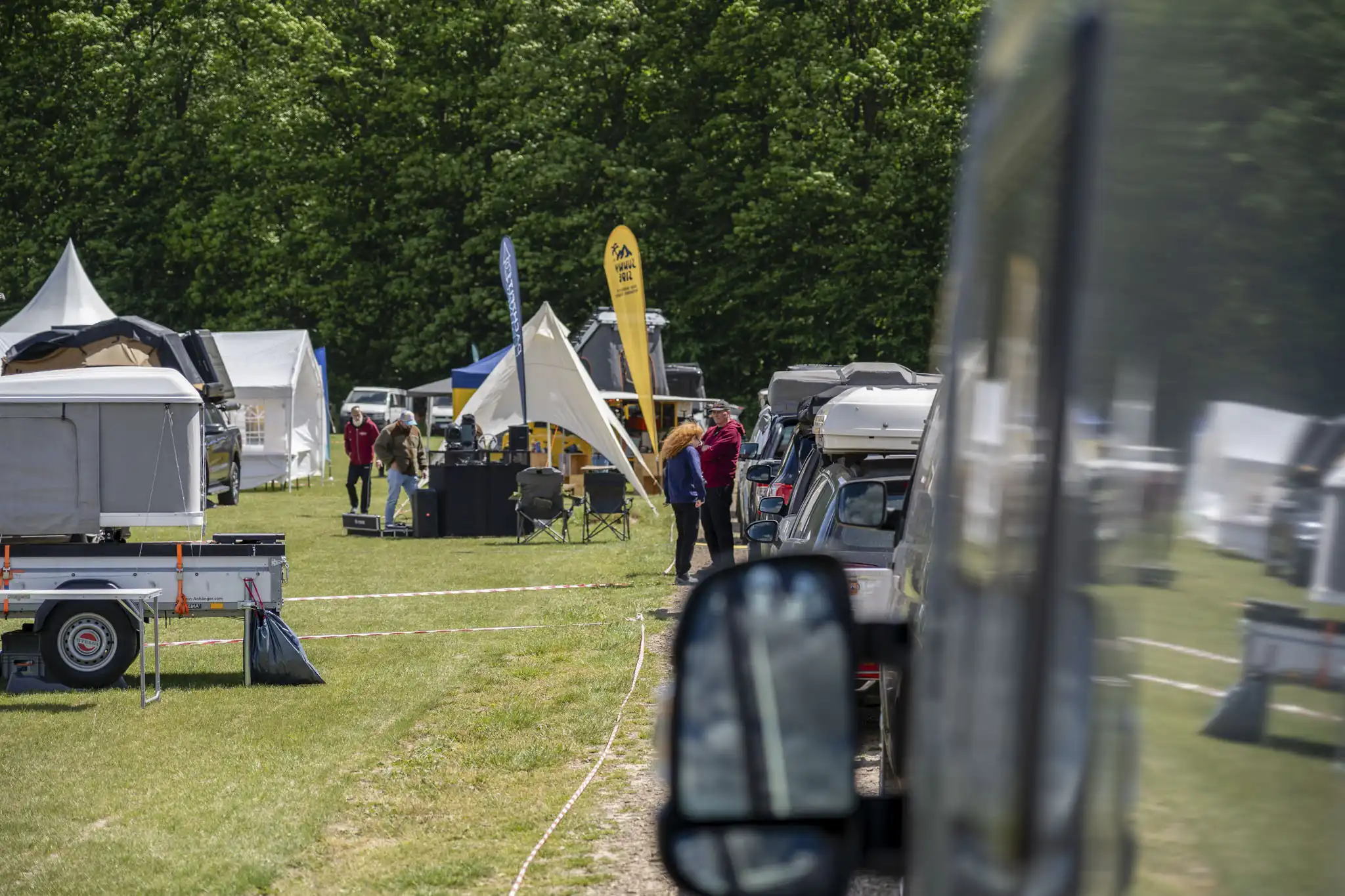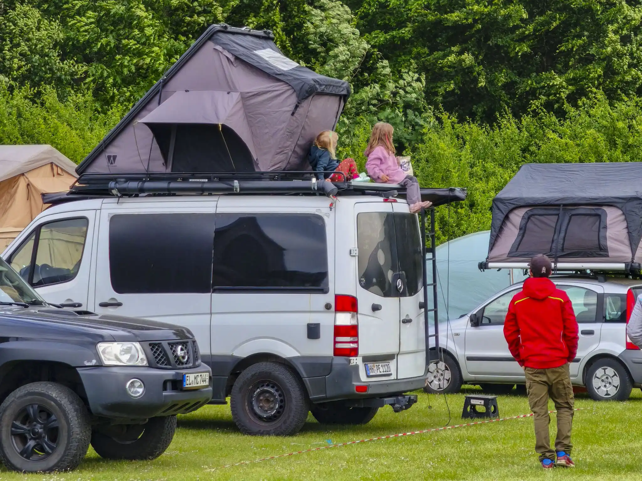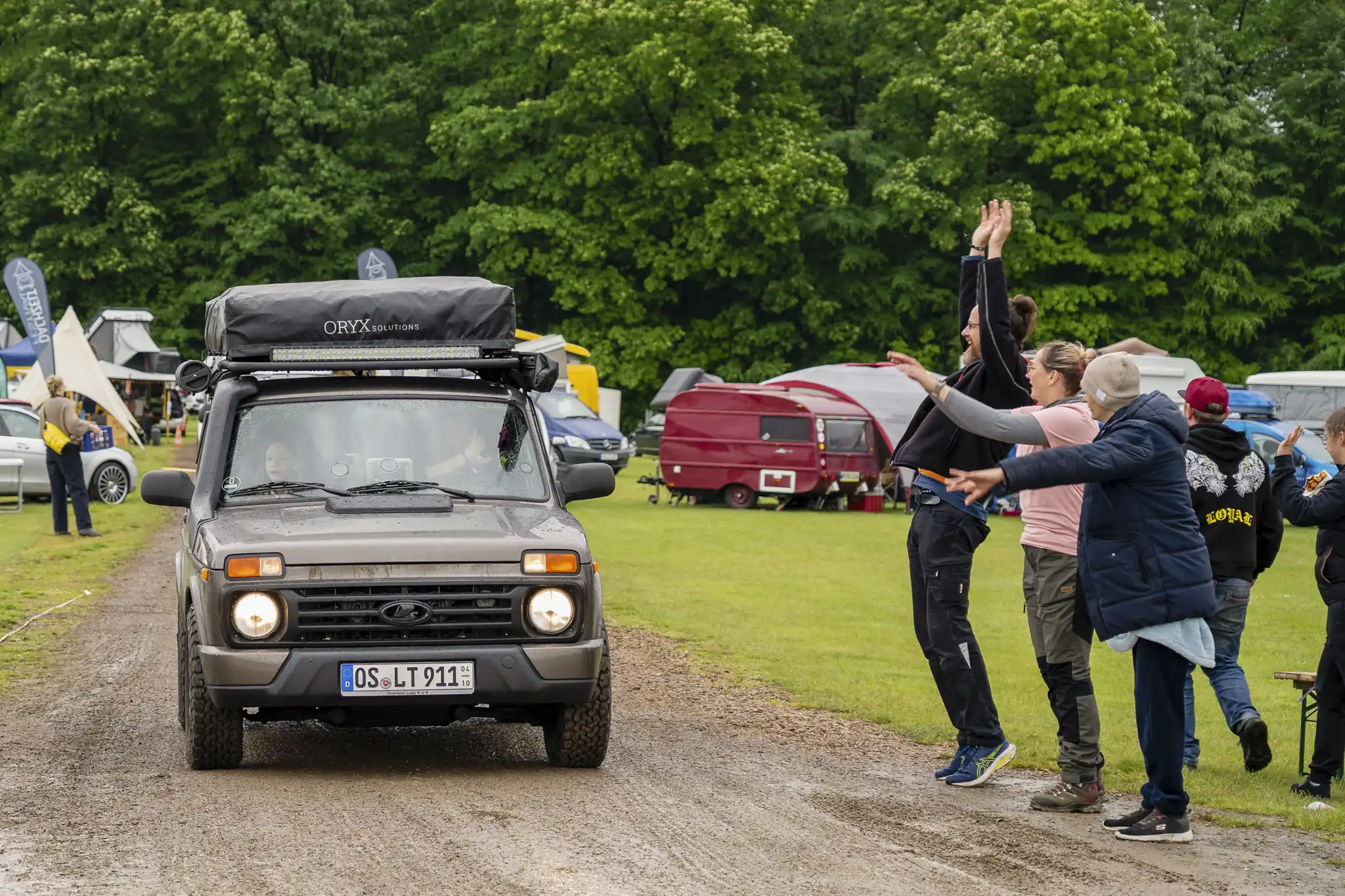 Trotz immer wieder kräftigen Regenschauern am Freitag lassen sich die Dachzeltnomaden die Laune nicht verderben. Sobald die Sonne wieder durchbricht, verwandelt sich das Gelände in ein buntes Meer aus Zelten und lachenden Gesichtern.