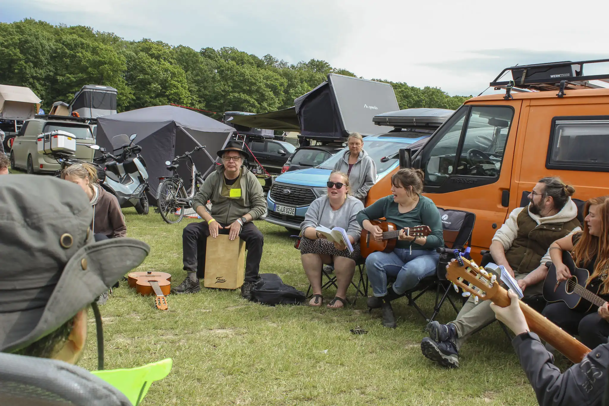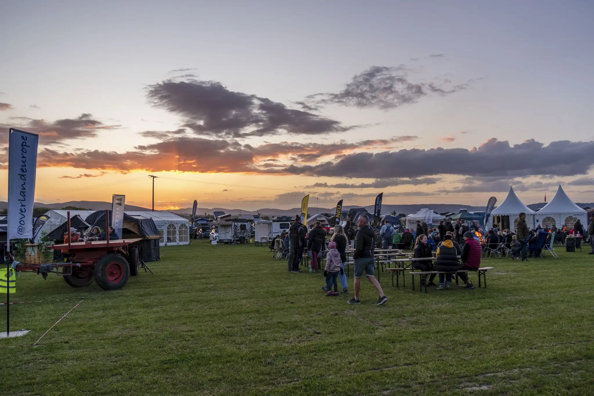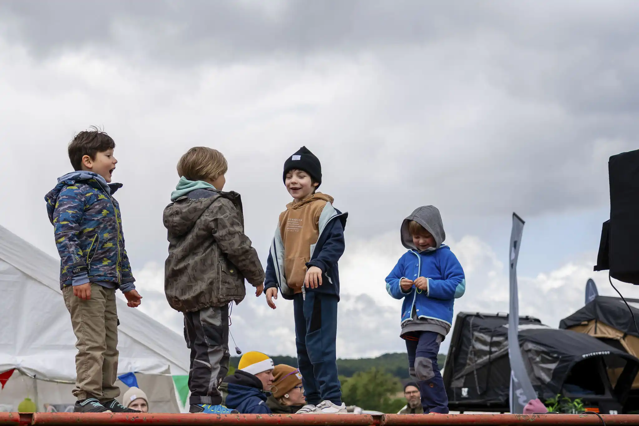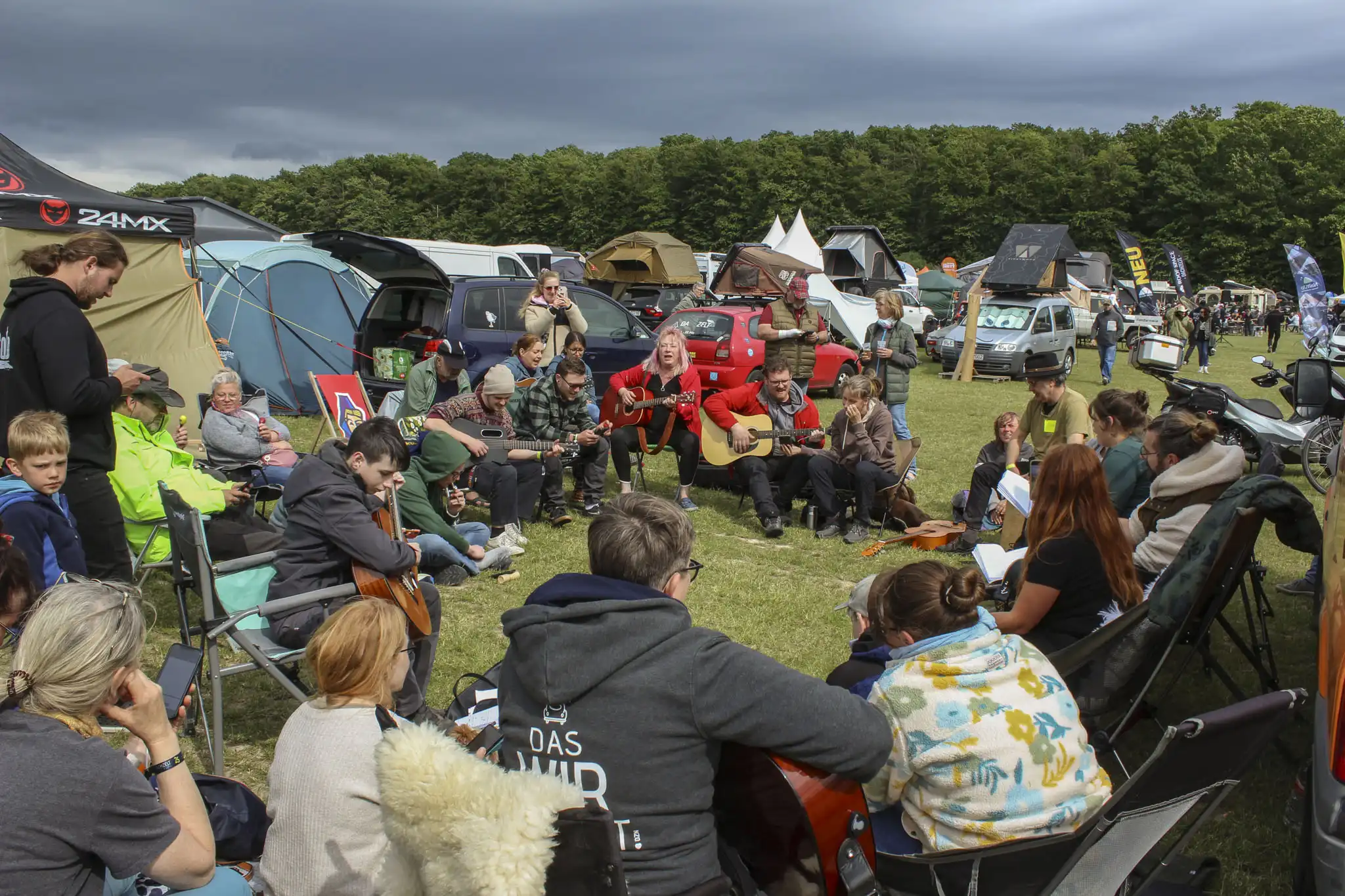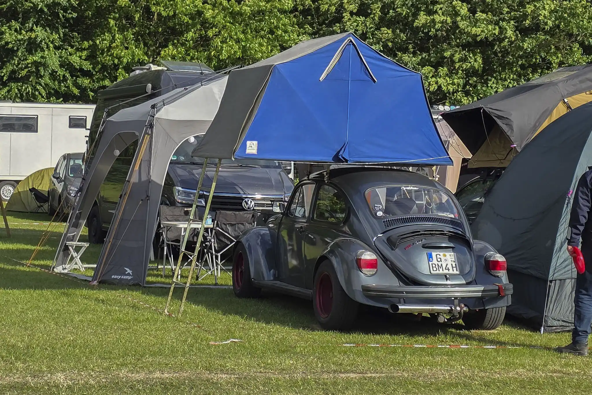 Trotz immer wieder kräftigen Regenschauern am Freitag lassen sich die Dachzeltnomaden die Laune nicht verderben. Sobald die Sonne wieder durchbricht, verwandelt sich das Gelände in ein buntes Meer aus Zelten und lachenden Gesichtern.