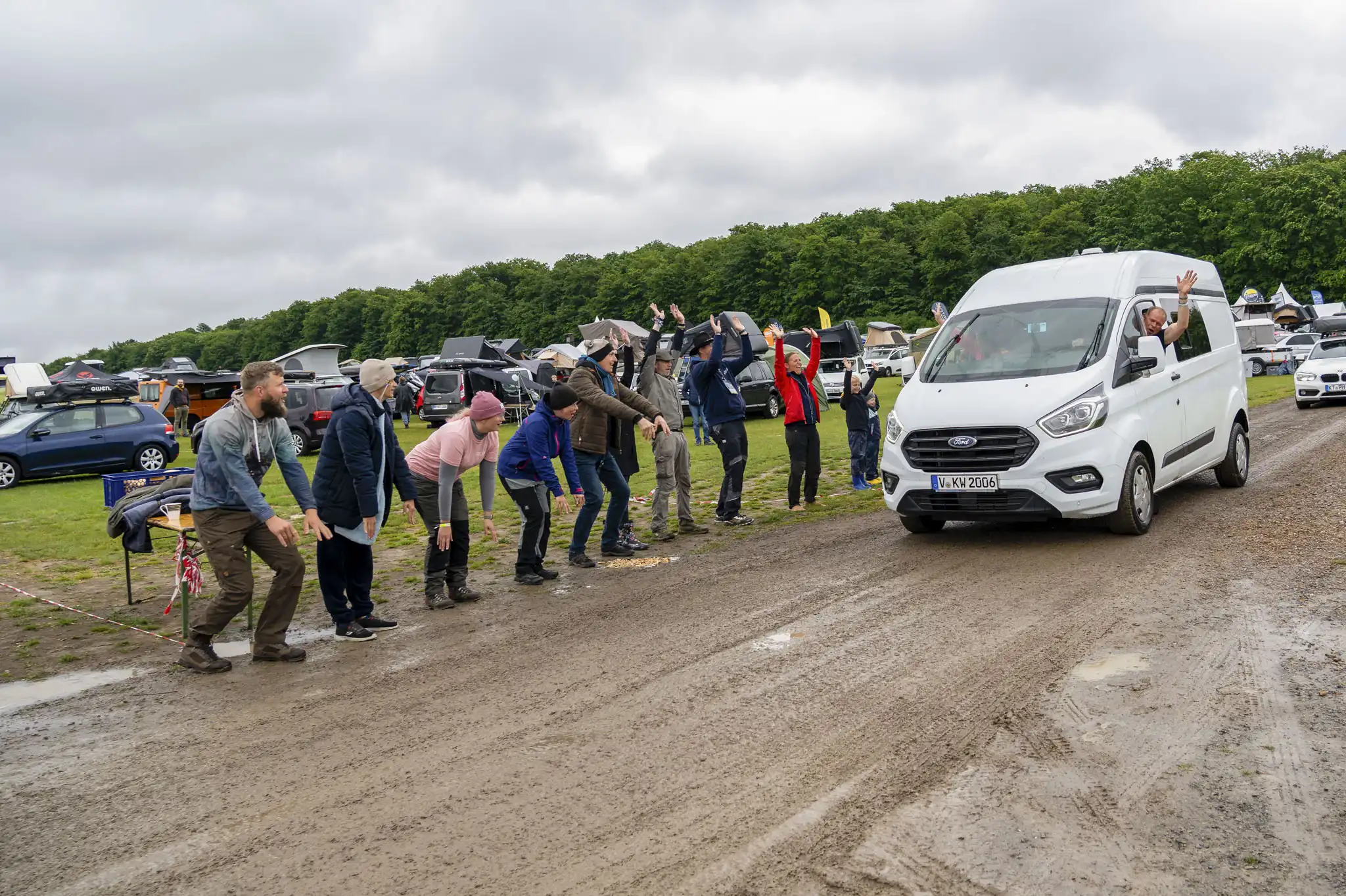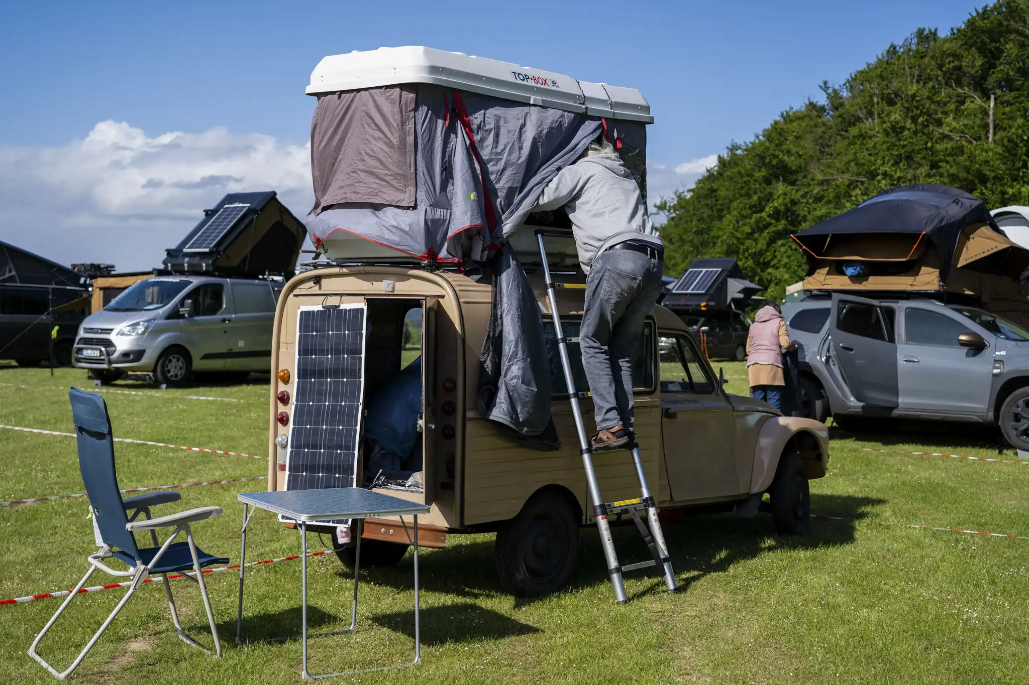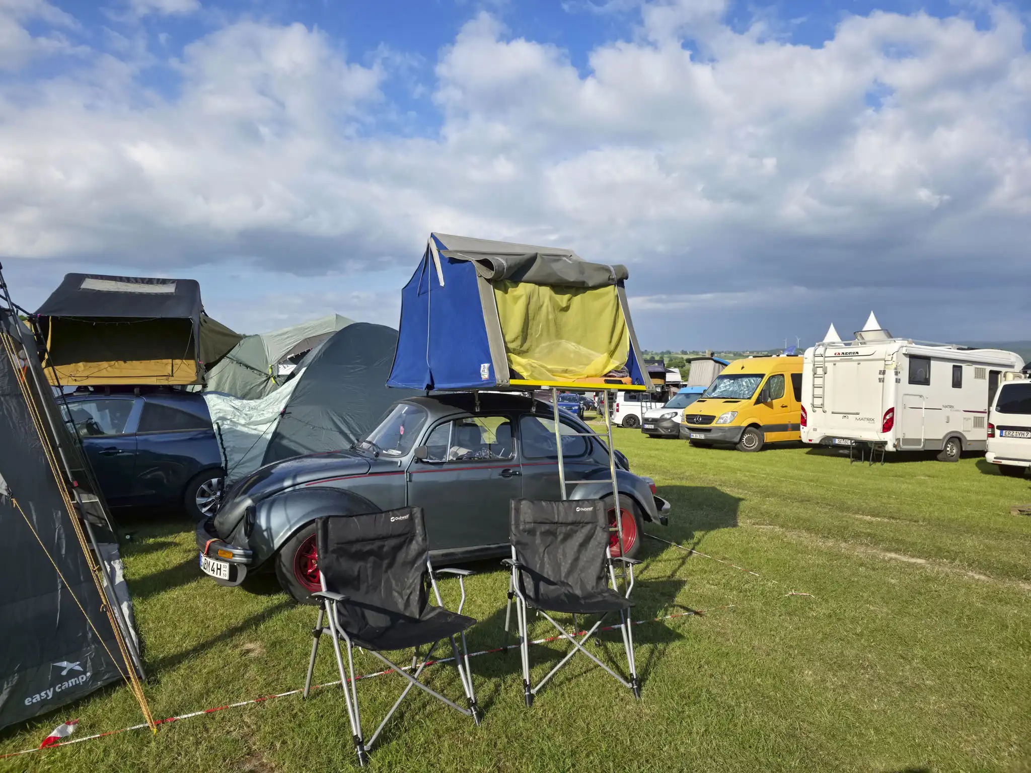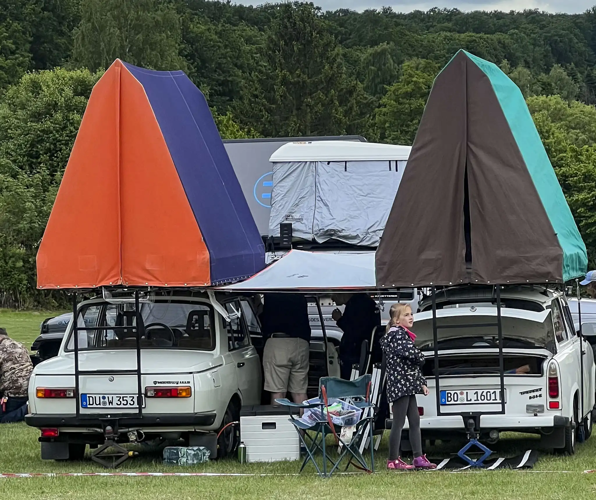 Trotz immer wieder kräftigen Regenschauern am Freitag lassen sich die Dachzeltnomaden die Laune nicht verderben. Sobald die Sonne wieder durchbricht, verwandelt sich das Gelände in ein buntes Meer aus Zelten und lachenden Gesichtern.