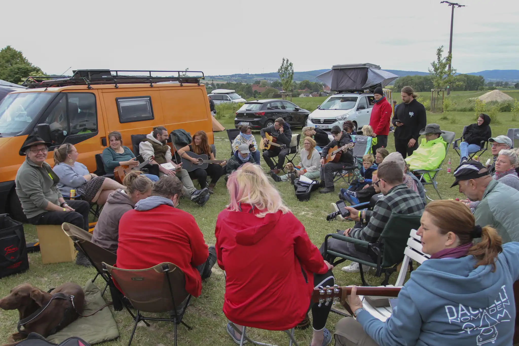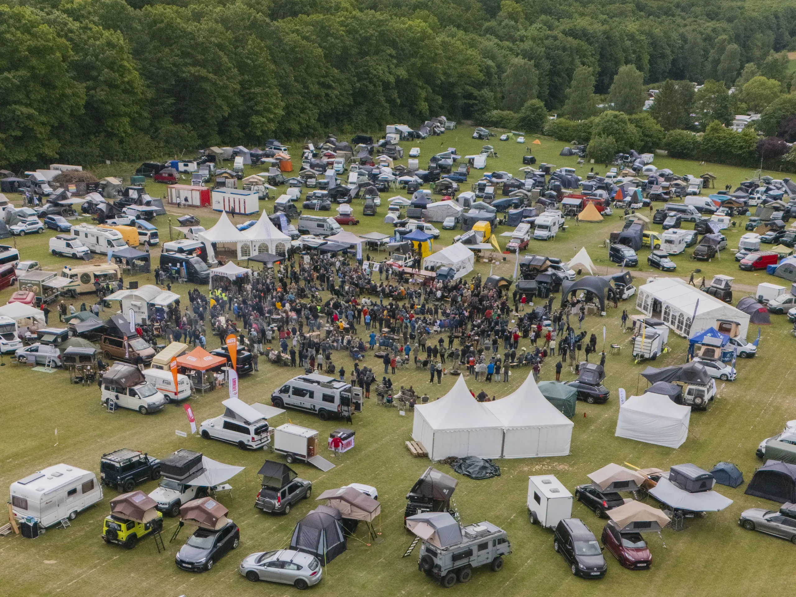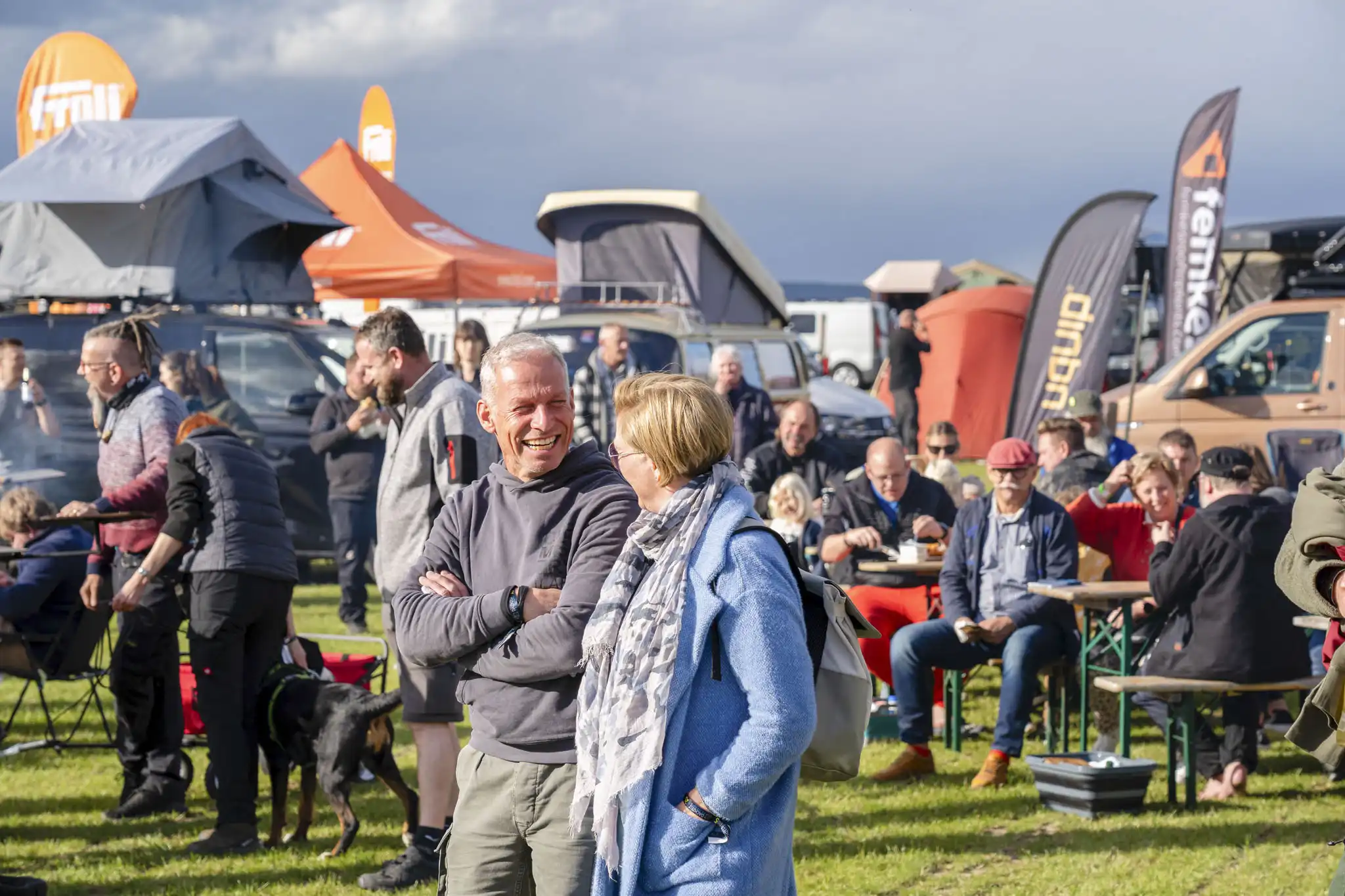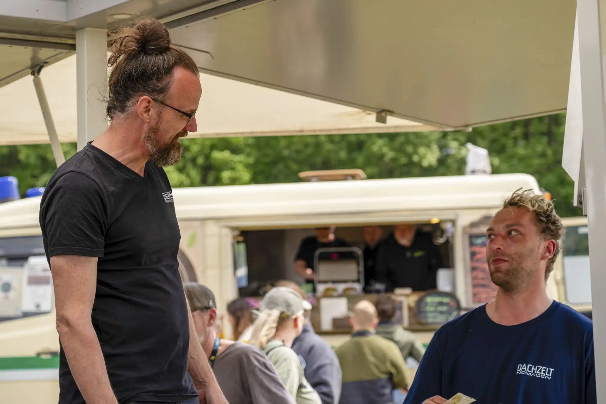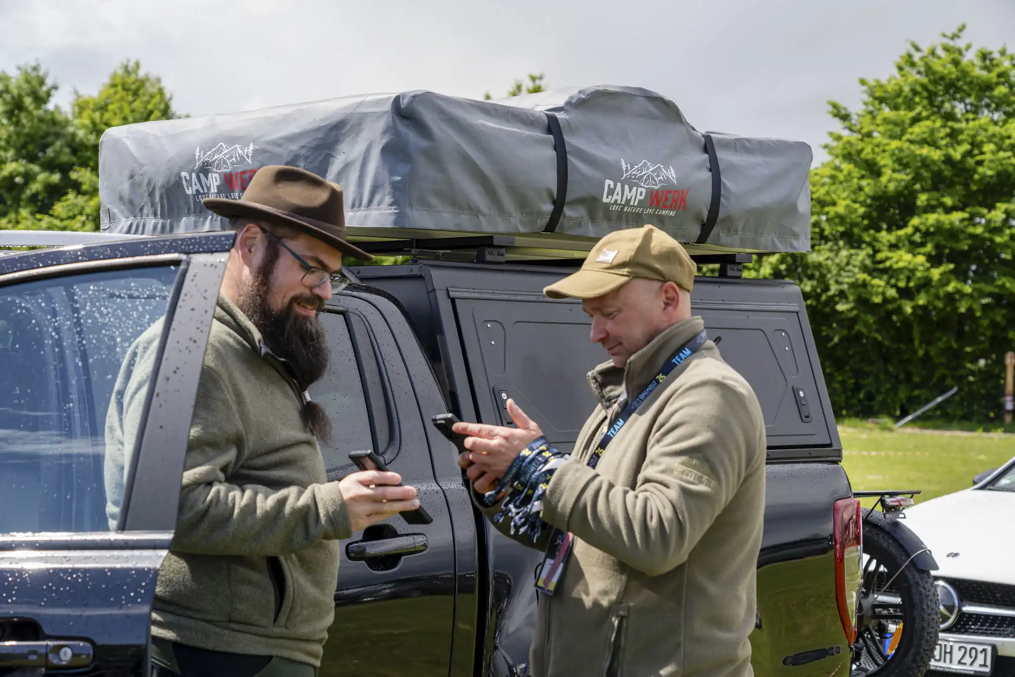 Trotz immer wieder kräftigen Regenschauern am Freitag lassen sich die Dachzeltnomaden die Laune nicht verderben. Sobald die Sonne wieder durchbricht, verwandelt sich das Gelände in ein buntes Meer aus Zelten und lachenden Gesichtern.