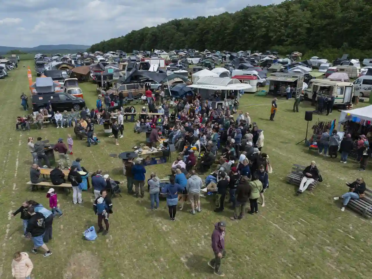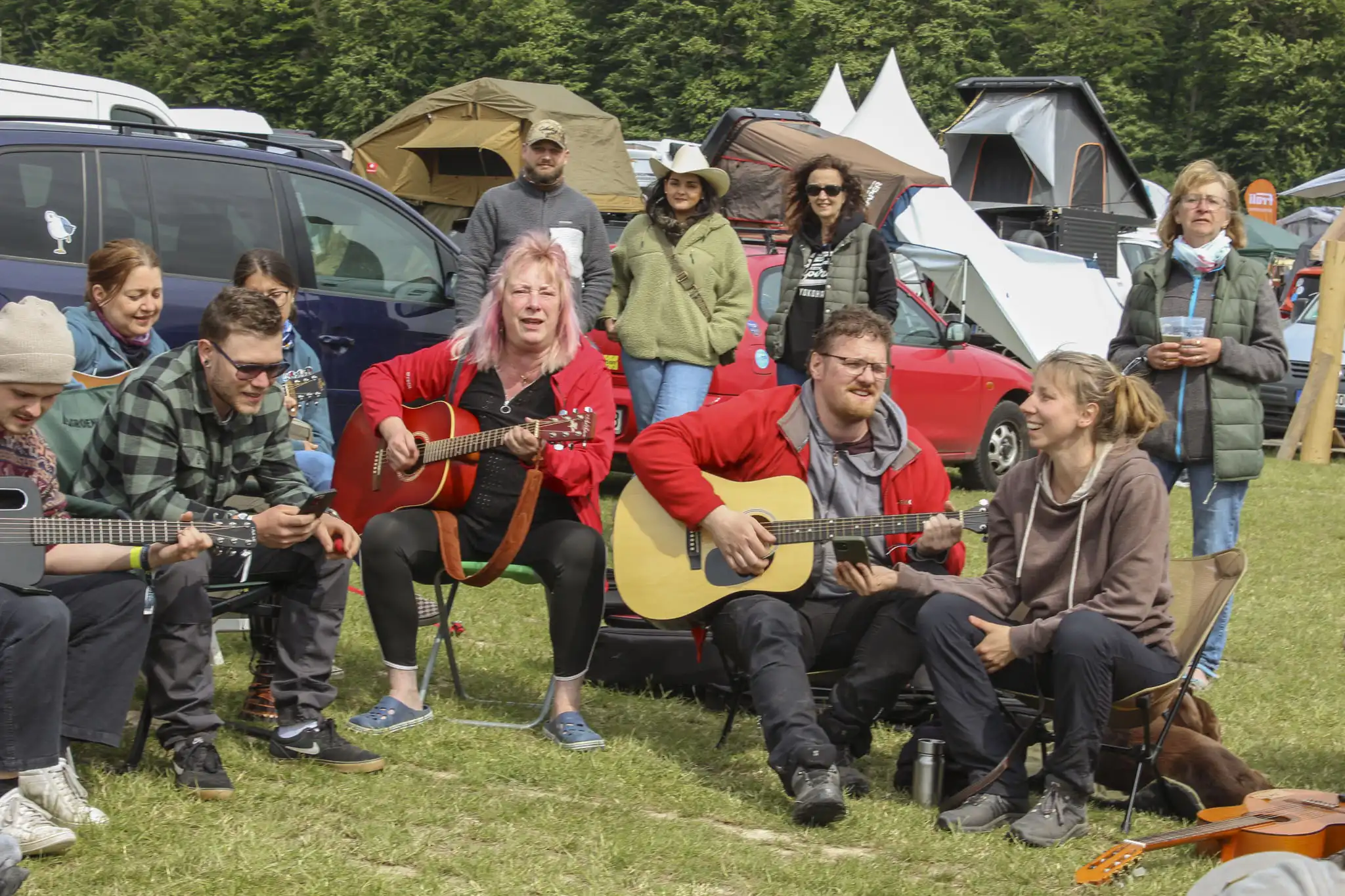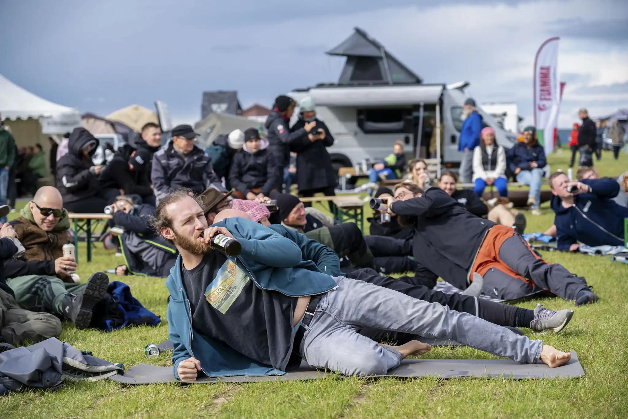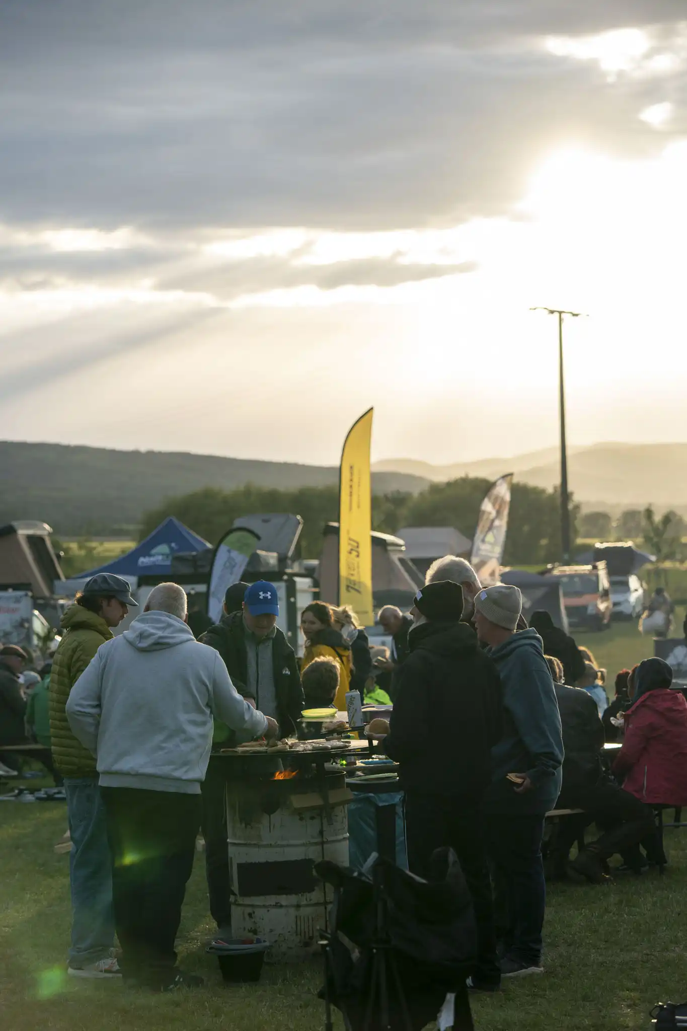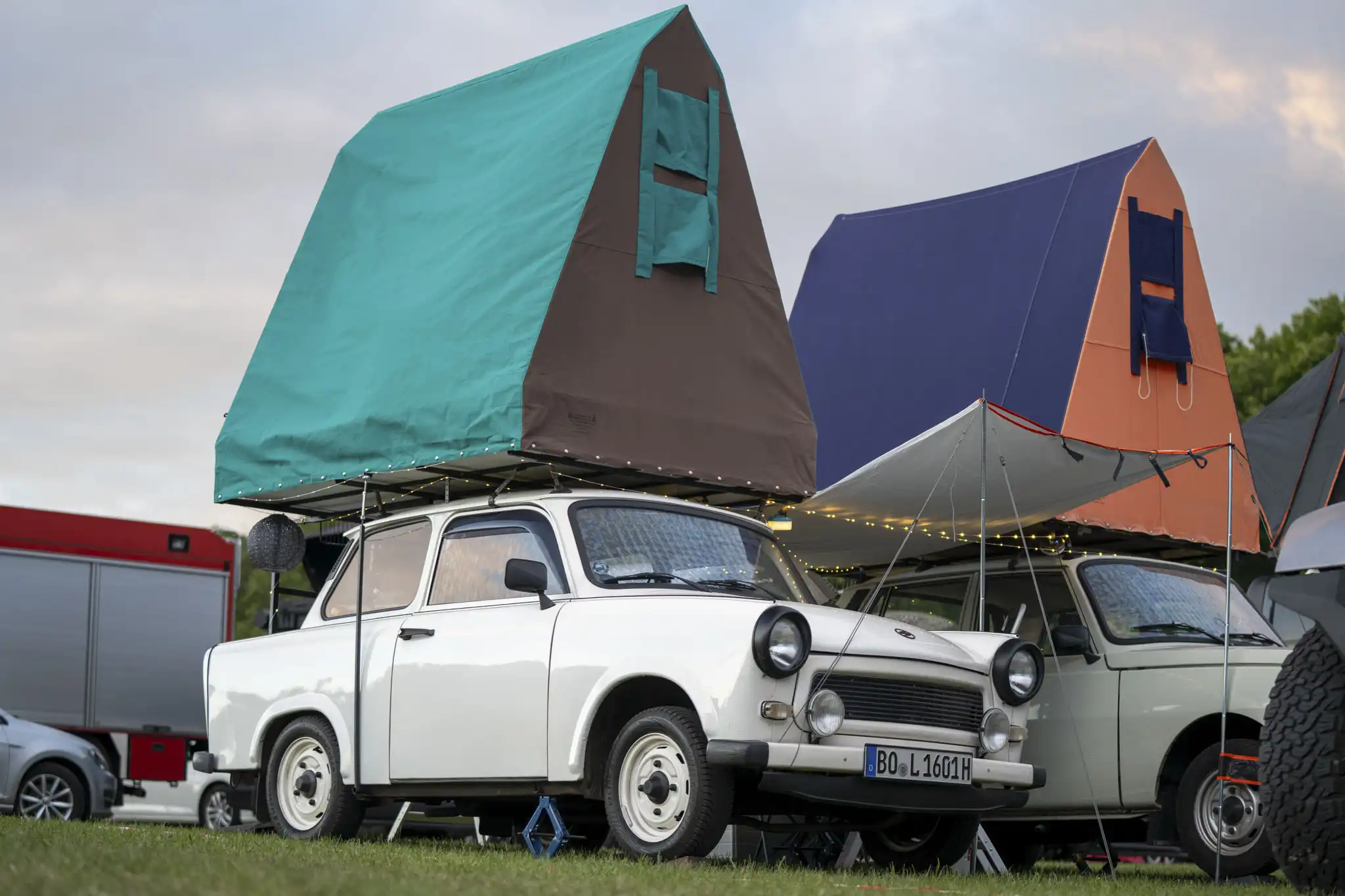 Trotz immer wieder kräftigen Regenschauern am Freitag lassen sich die Dachzeltnomaden die Laune nicht verderben. Sobald die Sonne wieder durchbricht, verwandelt sich das Gelände in ein buntes Meer aus Zelten und lachenden Gesichtern.