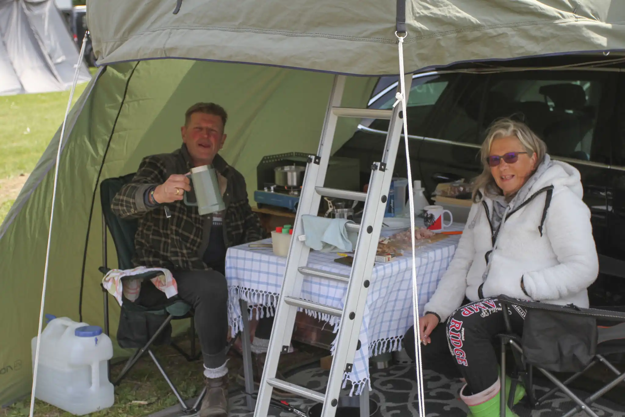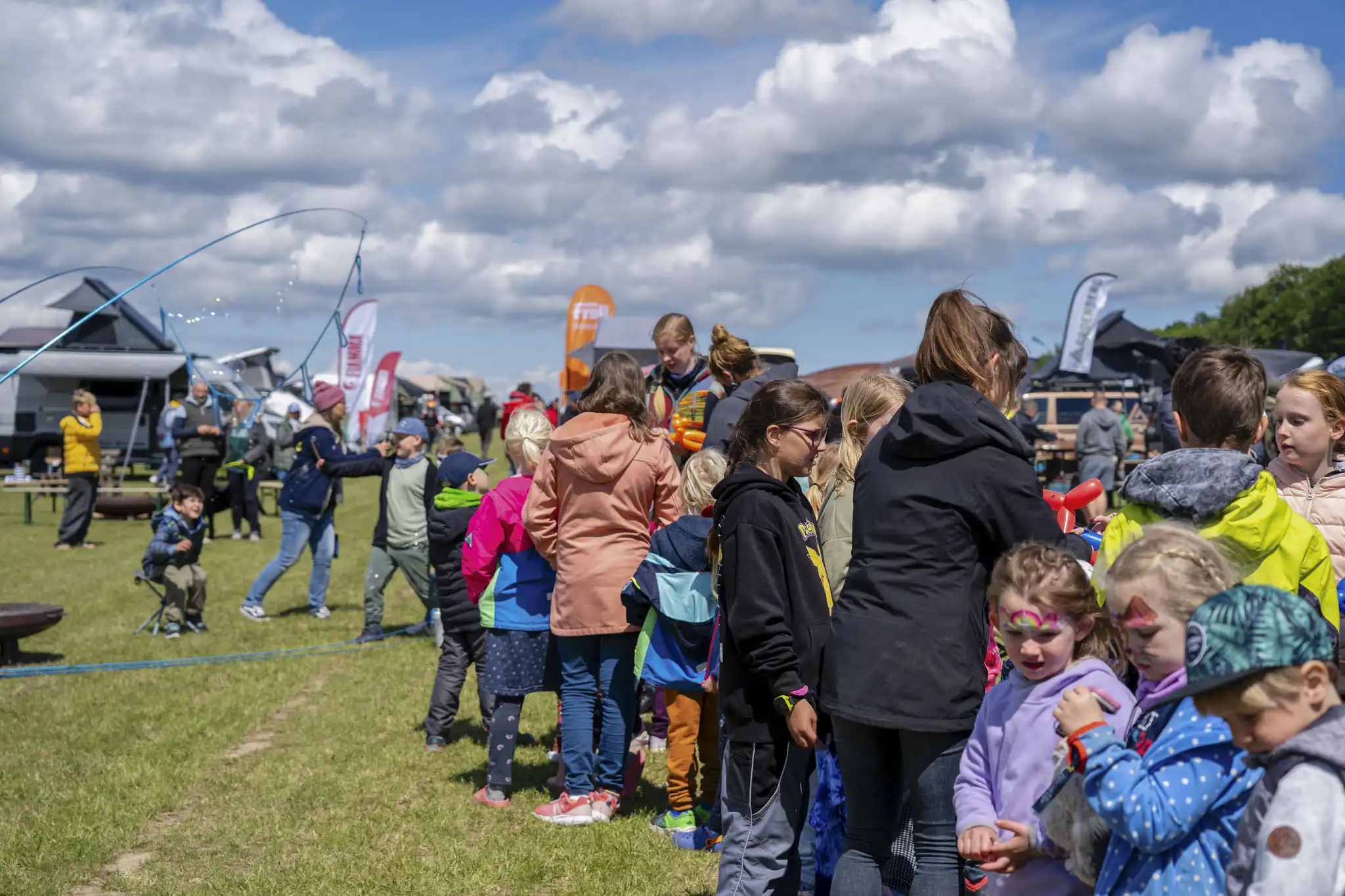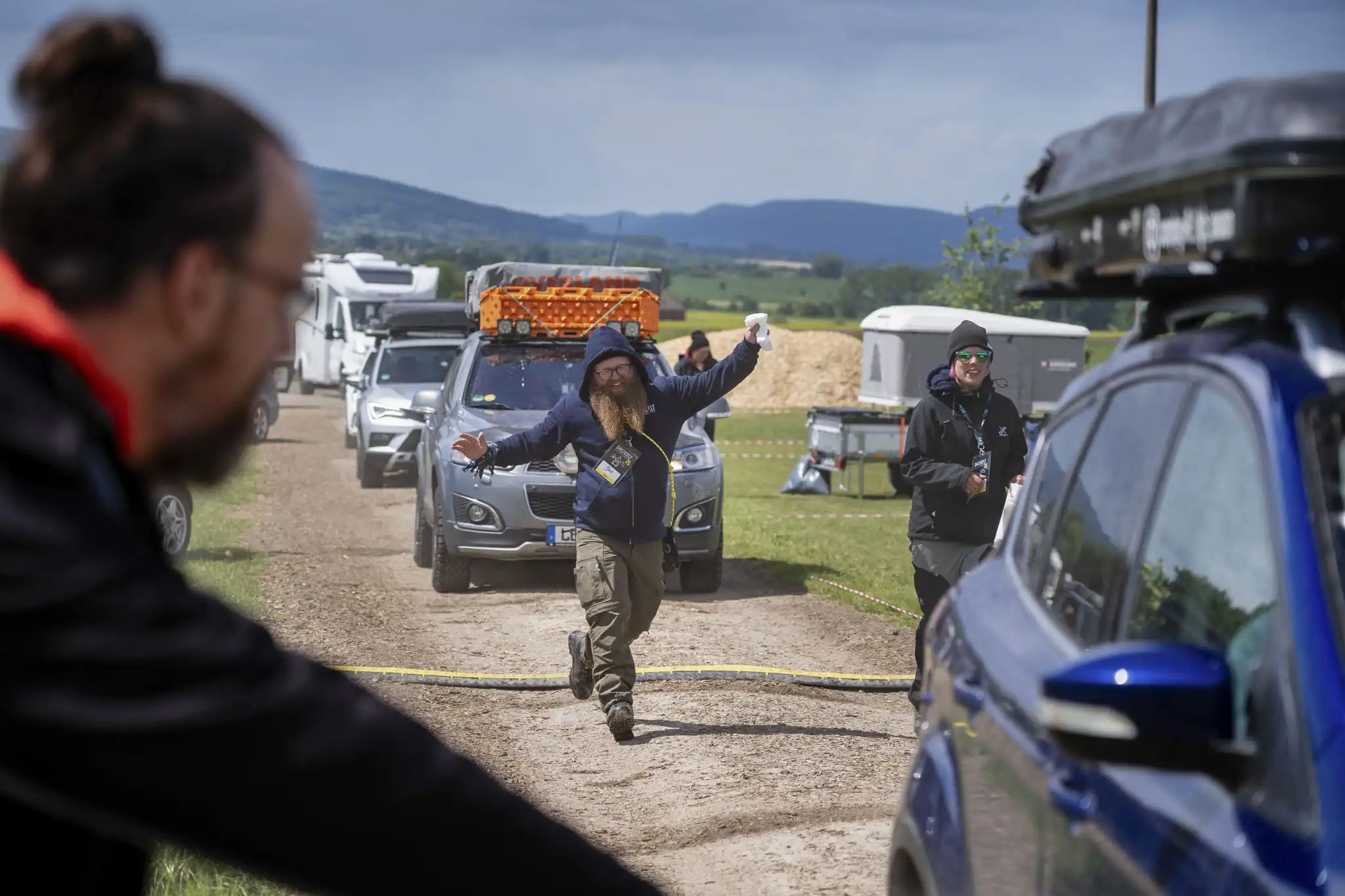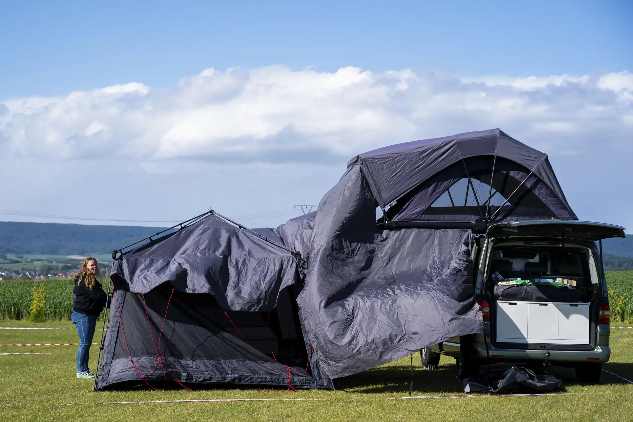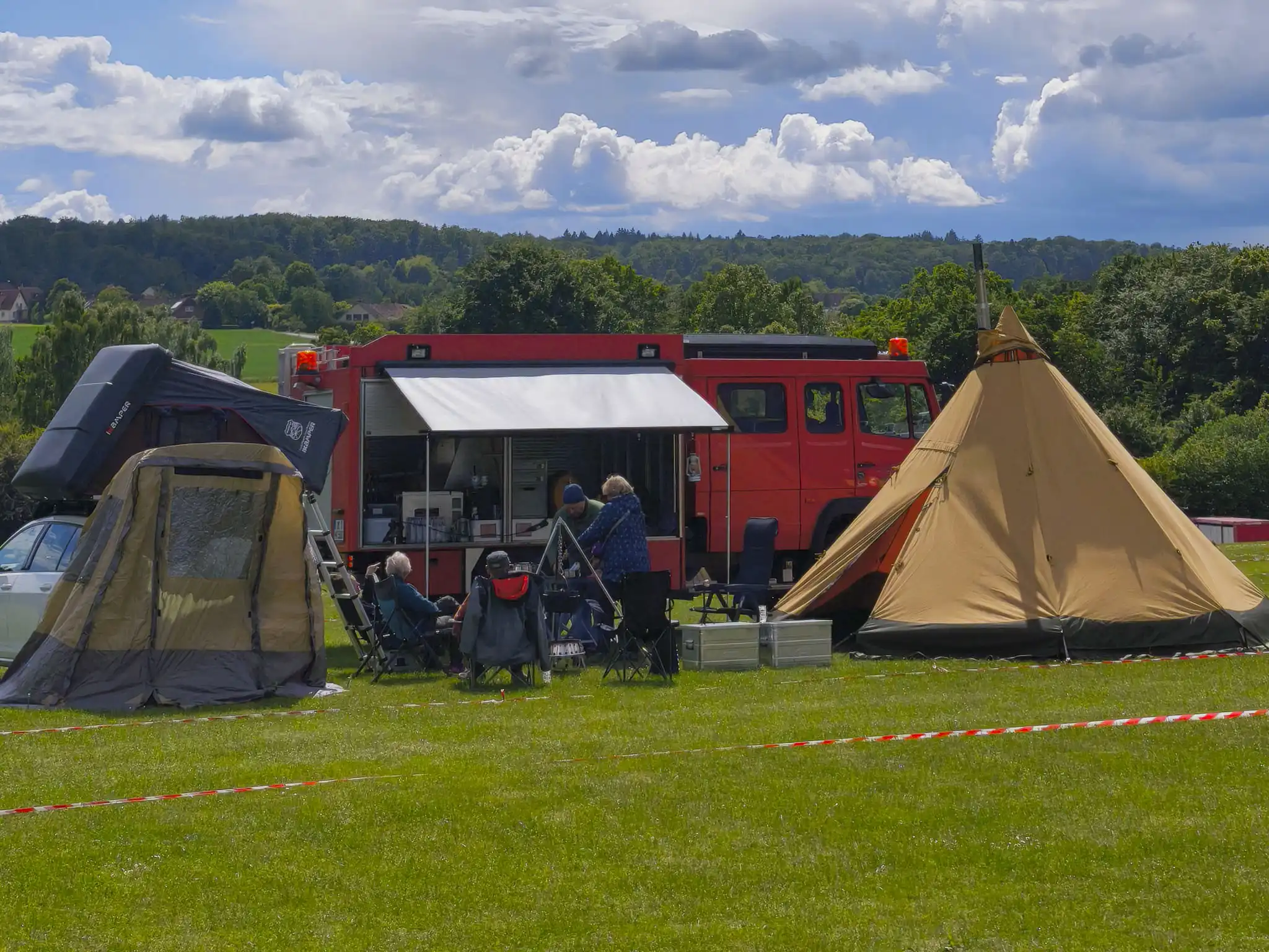 Trotz immer wieder kräftigen Regenschauern am Freitag lassen sich die Dachzeltnomaden die Laune nicht verderben. Sobald die Sonne wieder durchbricht, verwandelt sich das Gelände in ein buntes Meer aus Zelten und lachenden Gesichtern.