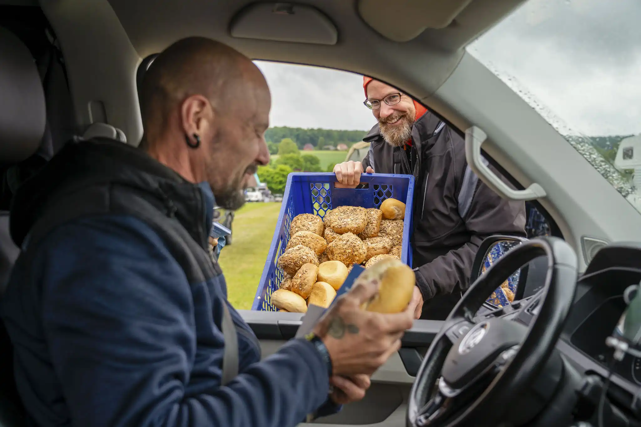 Der Brötchenservice vervollständigt das Angebot: Jeden Morgen ab 8 Uhr gibt es frische Backwaren, deren Erlös ebenfalls vollständig gespendet wird. Die traditionelle gemeinsame Frühstückstafel im Zentrum rundet das gemeinschaftliche Erlebnis perfekt ab.