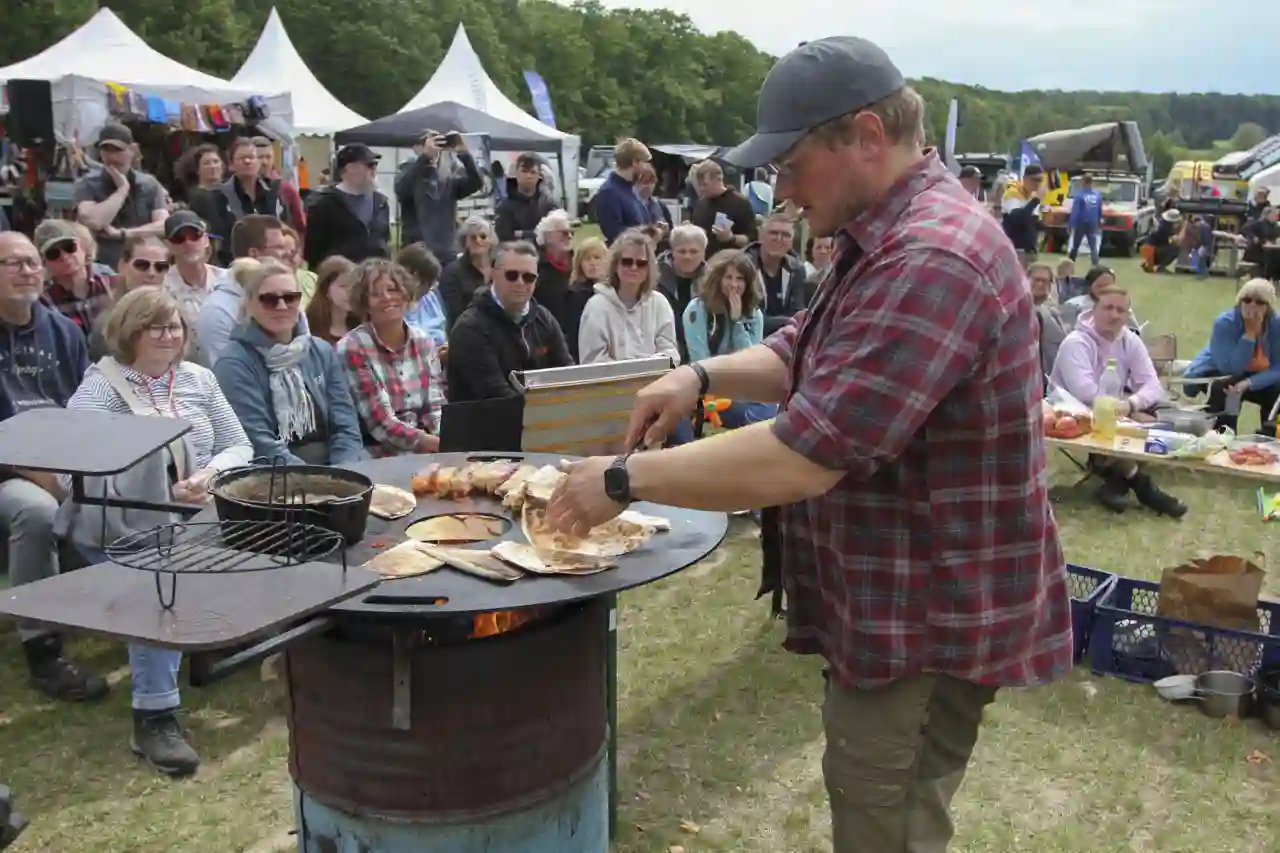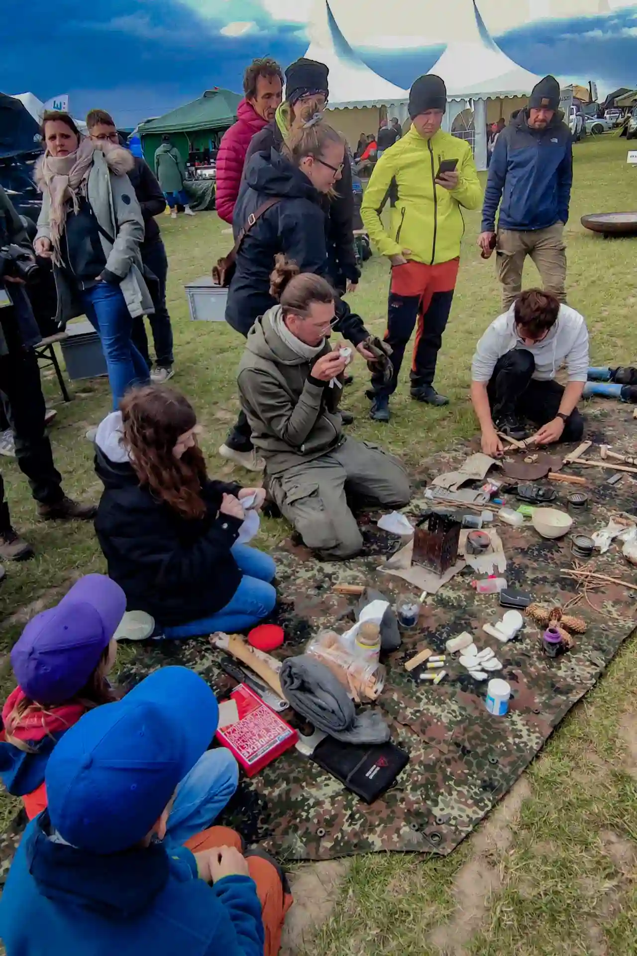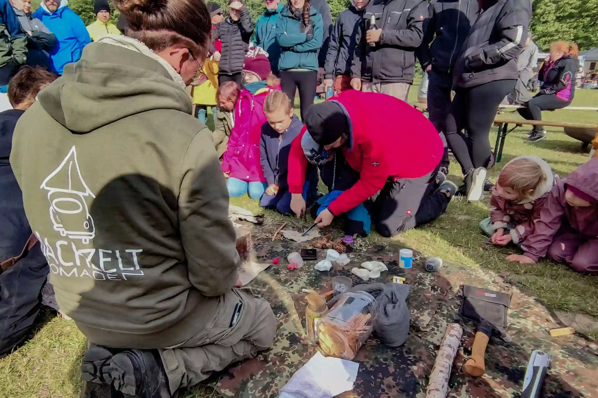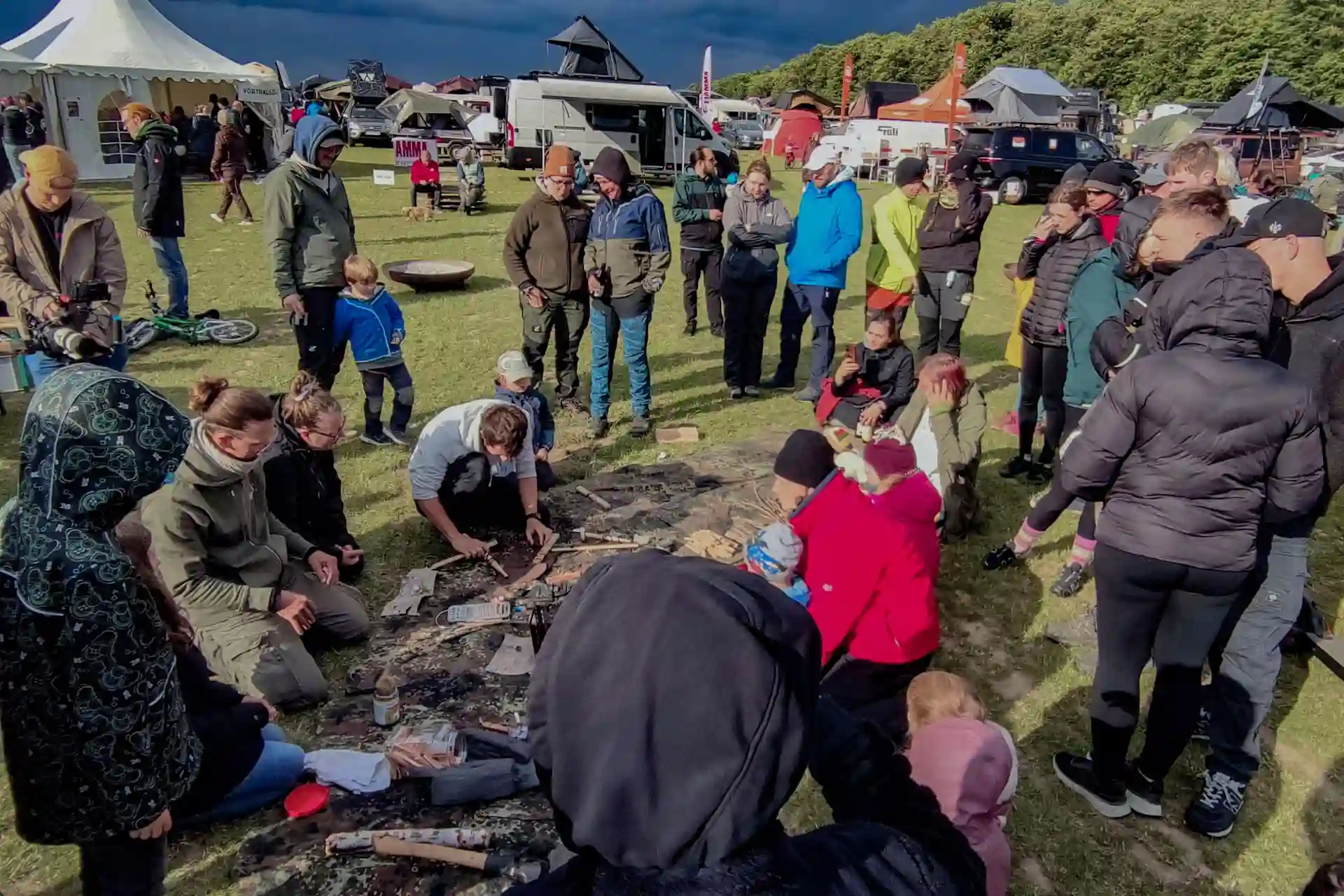 Outdoor-Küche & Handwerk Unsere praktischen Workshops sind ein voller Erfolg! Teilnehmer lernen in unserem Outdoor-Kochkurs, wie man auf kleinstem Raum köstliche Gerichte zaubert. Beim Feuer-Workshop geht es zurück zu den Grundlagen – von der richtigen Technik bis zur Herstellung eigener Feueranzünder.