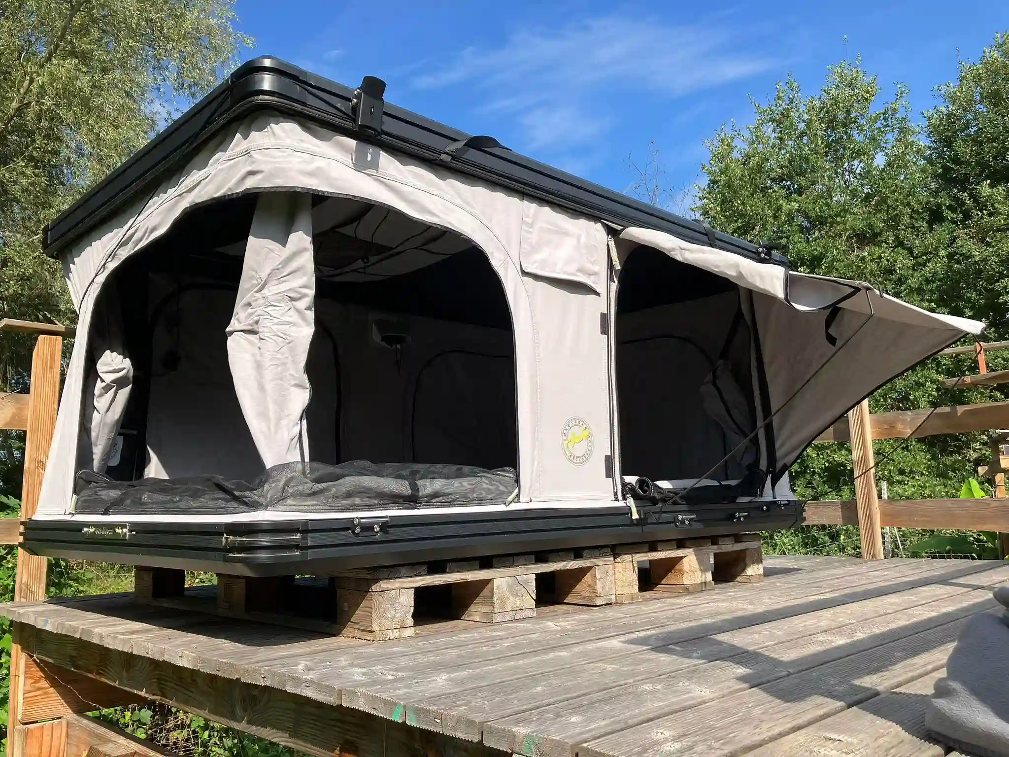 Das Dachzelt ist im April 2025 fabrikneu im DACHZELT DORF Rülzheim auf der Plattform Siesta eingezogen. Seither wird es dort von unseren Gästen Probe geschlafen und war bis zum Ende der Saison etwa 50 Nächte im Einsatz.