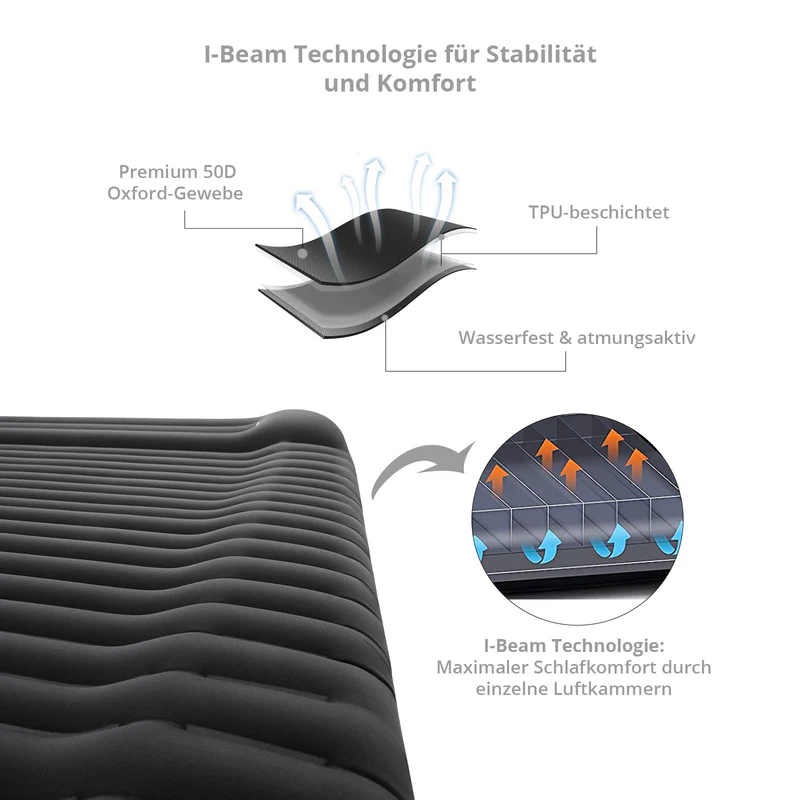 Durch das ergonomische Krümmungsdesign kann man nachts nicht so schnell von der Matte rollen und die horizontalen I-Beam Luftkammern sowie die Dicke von 10 cm sorgen für einen besonders komfortablen Schlaf. Inklusive integriertem Kissen, Schnell-Entlüftungsventil, Packsack und Reparatur-Set.