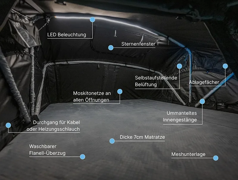 Das moenga S ist kompakt, schnell aufgebaut und ideal für Solo-Trips oder Reisen zu zweit. Die Teleskopleiter wird ausgezogen, das Zelt entfaltet sich in wenigen Minuten – ganz ohne Aufwand. Innen sorgt eine 7 cm dicke Matratze für bequemen Schlaf, während das wetterfeste Material bei Regen, Wind und Sonne schützt. Die integrierte LED-Beleuchtung bringt Licht ins Zelt. Mit einer Liegefläche von 140 cm bietet moenga S ausreichend Platz für ein bis zwei Personen – ideal für minimalistisches Reisen mit Komfort.